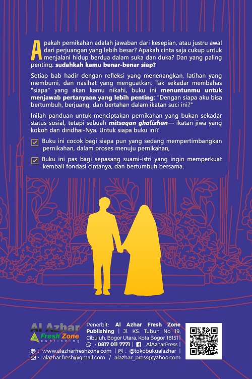 Setiap bab hadir dengan refleksi yang menenangkan, latihan yang membumi, dan nasihat yang menguatkan. Tak sekadar membahas “siapa” yang akan kamu nikahi, buku ini menuntunmu untuk menjawab pertanyaan yang lebih penting: “Dengan siapa aku bisa bertumbuh, berjuang, dan bertahan dalam ikatan suci ini?”